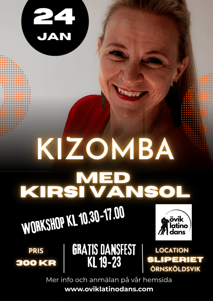 På dagen lär Kirsi VanSol ut nyckelprinciperna i kizomba – från stegteknik och ”ginga” till följsam förning och att tolka den härliga musiken. Passar både dig som redan dansar kizomba och dig som är nybörjare – men du bör någon pardansvana.